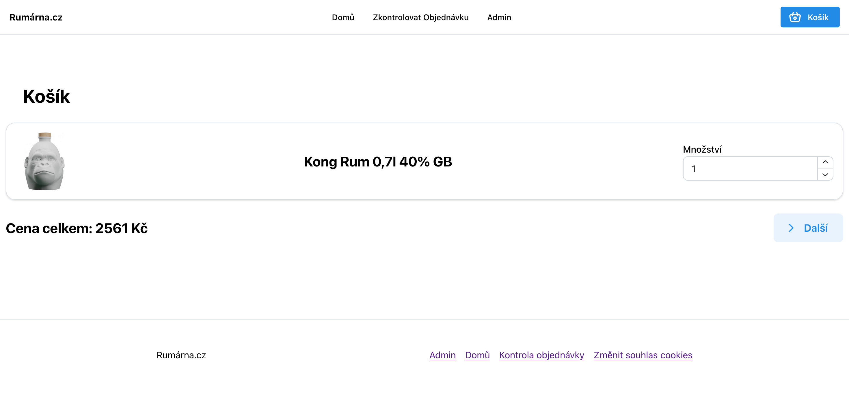 Po načtení košíku můžete vidět všechny produkty které jste si přidali do košíku. Můžete změnit množství nebo produkt kompletně odebrat. Klikněte na tlačítko další